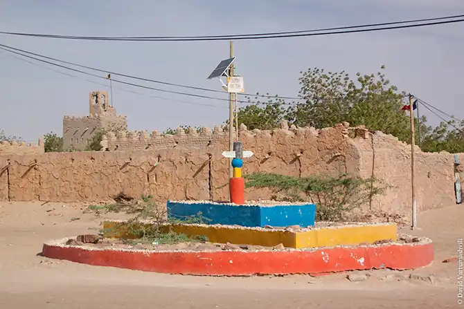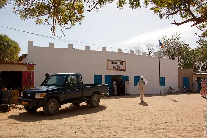 Прошло менее часа дороги, как мы въехали в городок Фада — родину президента Чада Идриса Деби, самого именитого представителя народности загава. По местным меркам это цветущий город с государственными институтами и даже собственной воинской частью. Здесь имеется два основных признака современной цивилизации: работает связь и можно купить кока-колу. Есть даже уличное освещение, работающее от солнечных батарей. На выезде из Фады можно заметить аэродром, что говорит о стратегическом значении города. Строится крупный госпиталь. Город живет, в общем. В Фаде под завязку были заправлены автомобили, и пополнены запасы воды.