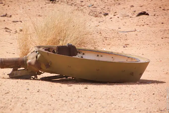 Вскоре, поднимая клубы пыли, мы уже неслись через пустыню. По дороге снова встречалась подбитая техника, пробитые каски. Иногда попадались одинокие могилки, а иногда и просто груды выбеленных костей, хотелось бы думать, что верблюдов, но… Или тела ливийских солдат не предавали земле вовсе, или их выкопали какие-нибудь хищники, типа шакалов. Омар как-то безучастно сказал, что этого добра здесь много. На нас же картина производила скорее гнетущее впечатление.