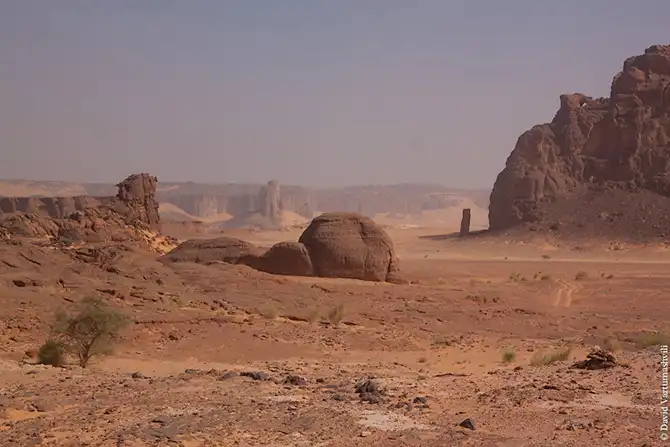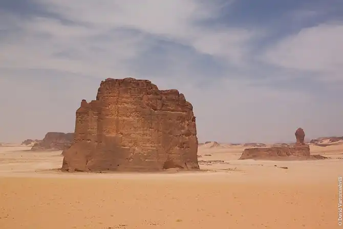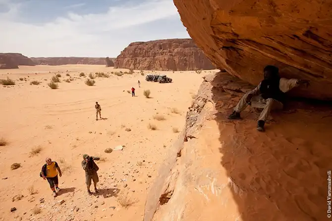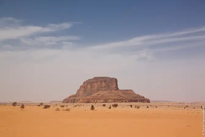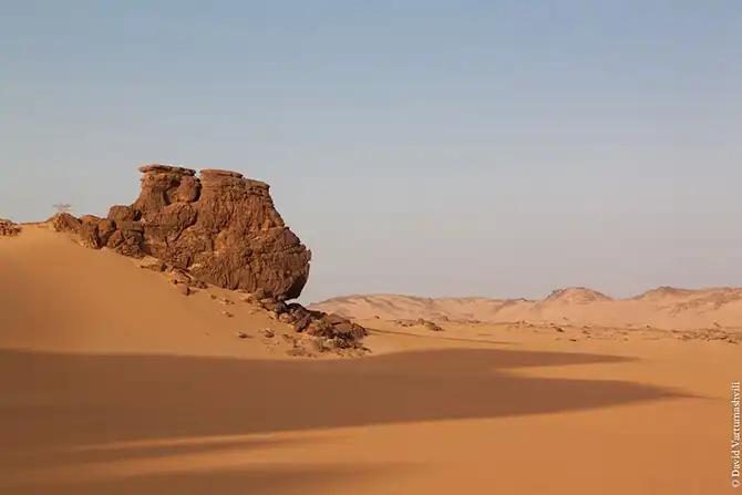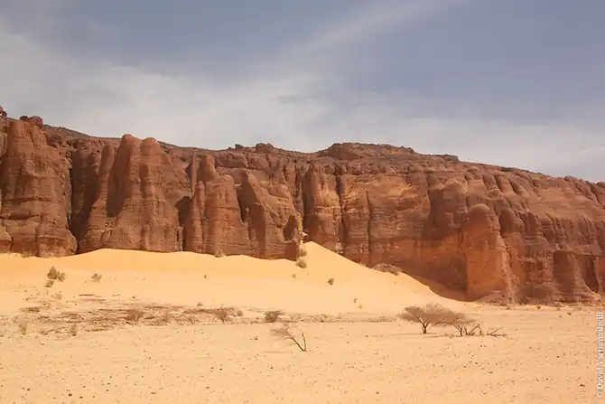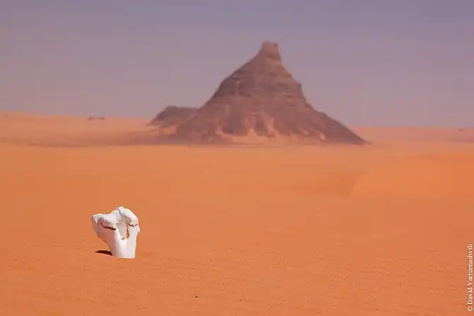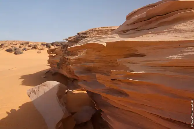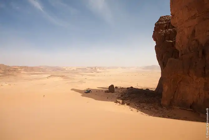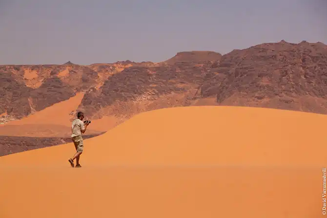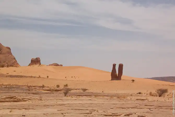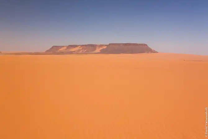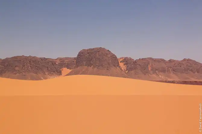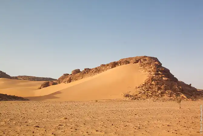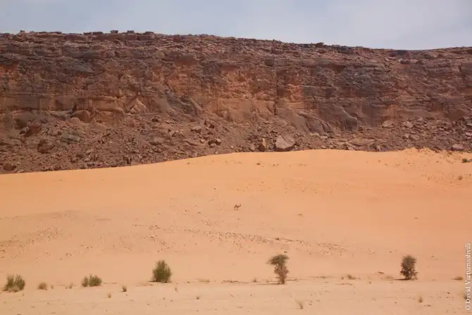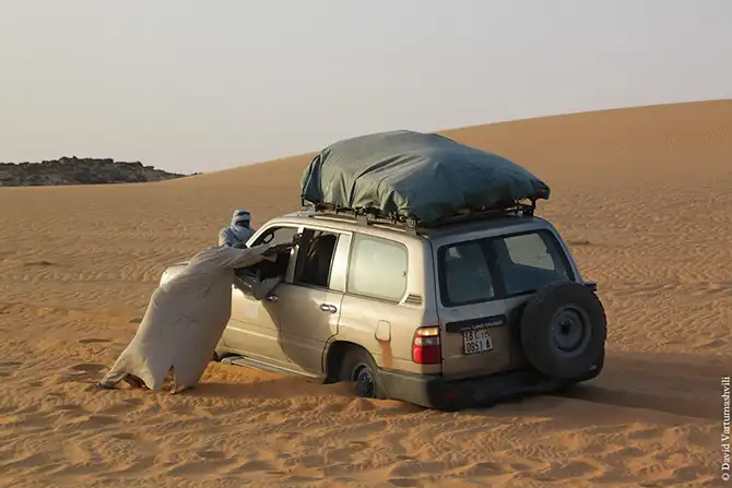 Мы продолжили движение вдоль массива Бичигара. Справа тянулась бесконечная горная гряда, возможно, скрывающая плато. Пространство слева занимали сильно разрушенные старые горы, окруженные песчанными наносами. Дорога привела в высохшее русло вади Вен. После обеда мы покинули Эннеди. Гор, выглядывающих из песка, становилось все меньше и меньше, они мельчали и исчезали в песке. Вскоре их почти не осталось, лишь за горизонтом медленно скрывались остатки вершин массива. Автомобиль снова разогнался по ровному крупному песку. Мелкие камешки делали песок похожим фактурно на асфальт, отличие было лишь в цвете и в мелодичном шуршании подспущенных шин. Пейзаж снова стал безжизненным и унылылм, исчезли даже вездесущие верблюды, что было верным признаком отсутствия человеческого жилья на многие километры вокруг. Постепенно начали появляться дюны. Если песок пустыни до этого был жестким, с камнями, то дюны состояли из мельчайшей песочной пыли. Горячий ветер пустыни врывался в окно и эта пыль била по лицу. Один хлопок по одежде поднимал облако пыли, приборная доска быстро заросла ровным слоем песка. Делая мелкие глотки из нагретой бутылки, я сожалел, что не купил четыре метра ткани в Фаде и не сделал из них тюрбан, так хорошо защищающий от песка лицо и, главное, легкие.
