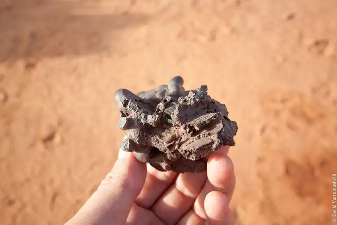 Утром удалось немного осмотреться и оказалось, что лагерь мы разбили на месте доисторического металлургического завода. Под ногами валялись остатки нескольких тигелей — ёмкостей для плавки железа. Пользуясь ветром, сквозящим через щели в скалах, древние люди выплавляли в этом месте металл из железосодержащего песчанника. Сейчас невозможно даже предположить в каких частях света могли оказаться произведенные здесь вещи. На масштабы производства красноречиво указывала задействованная площадь — окрестности лагеря были засыпаны расплавленными кусками железа с характерными вкраплениями угля.