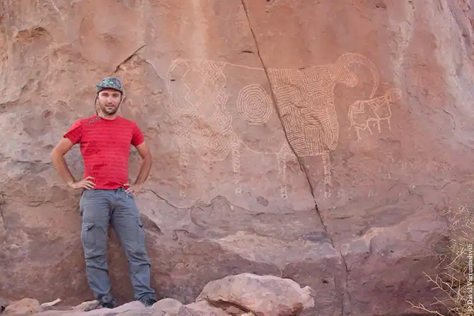 Омар показывает очередные петроглифы, обнаруженные им у основания скалы:
