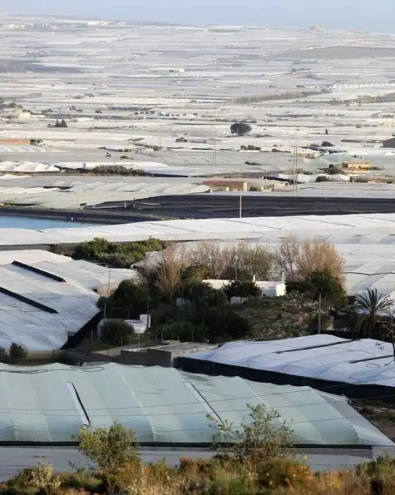 Это снимок, сделанный с борта самолета, на котором вы видите место под названием «грандиозные теплицы Альмерии». Еще с 80х годов прошлого века эта небольшая прибрежная равнина в 30 км на юго-запад от испанского города Альмерия превратилась в крупнейшее сосредоточие теплиц в мире, занявших почти 26 000 га.