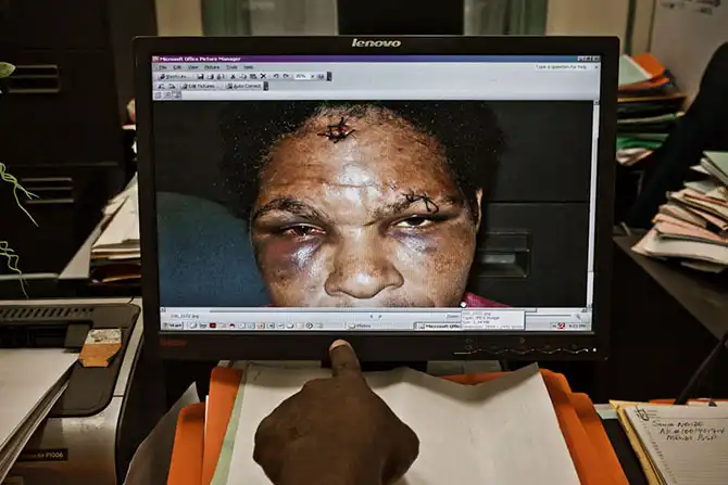 «Плачущая мери». Полицейский Джоб Эремуго показывает на экране компьютера фотографию женщины, ставшей жертвой домашнего насилия. По его словам, в полицейский участок района Бороко ежедневно как минимум три женщины сообщают о фактах насилия со стороны мужей или неустановленных лиц. Фото: Влад Сохин