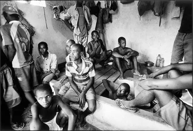 «Дети за решеткой». Тюрьма в городе Амбанья (Мадагаскар). Площадь этой камеры ― 10 квадратных метров, и в ней содержится 20 малолетних преступников. Самые слабые спят в узких душных ячейках прямо на земле между деревянными настилами, на которых отдыхают их более сильные сокамерники. «Клопы едят нас всю ночь напролет, а крысы обгрызают пальцы рук, поскольку у нас нет мыла и от рук пахнет едой». Фото: Лиззи Садин