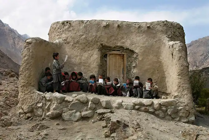 «Афганистан. Между миром и войной». Афганские школьники читают молитвы в разрушенном доме, служащем им школой, в горном селении в Ваханском коридоре. Фото: Паула Бронштейн