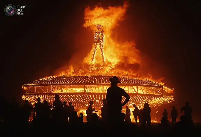 Горящая фигура человека на фестивале музыки и искусств «Burning Man 2013» в пустыне Блэк-Рок, штат Невада.