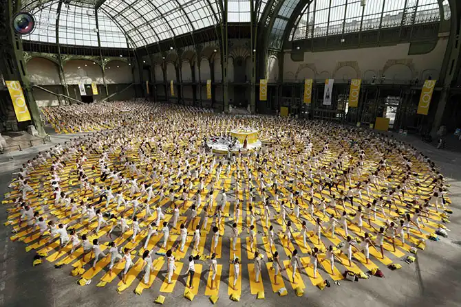 Люди участвуют в групповом занятии йогой в Большом дворце в Париже.