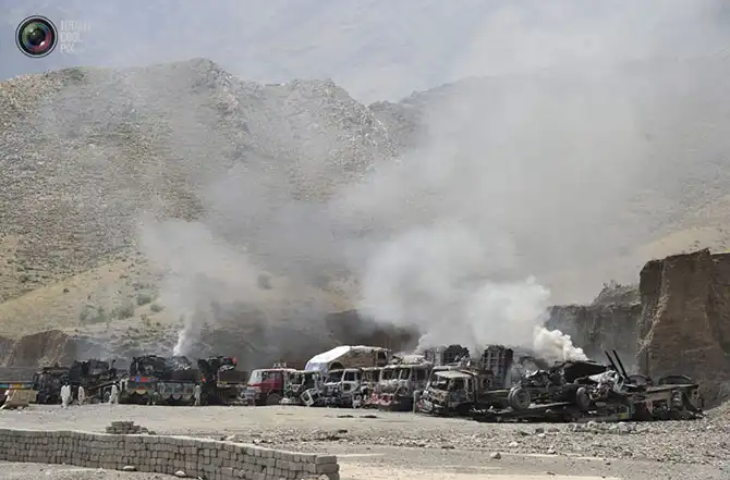 Грузовики, совершавшие поставки для сил НАТО, горят после атаки талибов в районе Torkham, Пакистан.