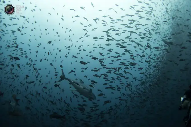 Тунец плавает среди рыб в морском заповеднике на Галапагосских островах.
