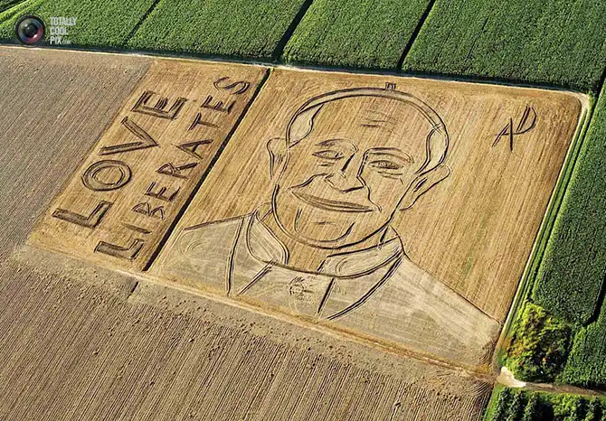 Портрет Папы Франциска, выполненный итальянским художником Дарио Гамбарином на скошенном пшеничном поле в Кастаньяро, Италия.