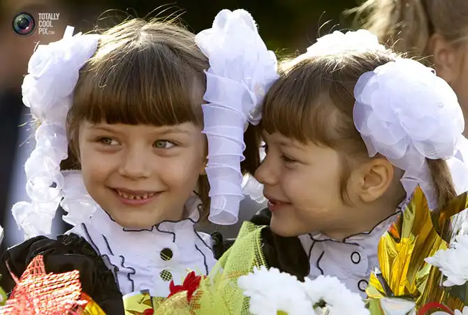 Первоклассницы стоят на торжественной линейке в школе в Слуцке, Беларусь.
