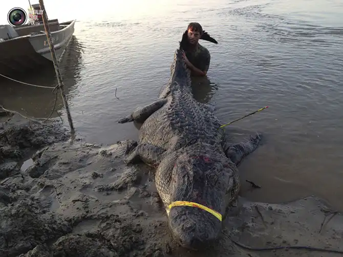 Мужчина позирует с рекордно крупным аллигатором, пойманным в Виксберге, штат Миссисипи.