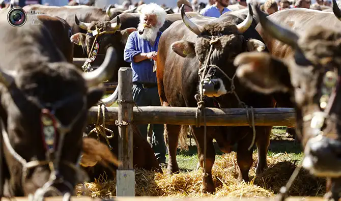 Мужчина осматривает быков на традиционной ярмарке домашнего скота Stierenmarkt в швейцарском городе Цуг.
