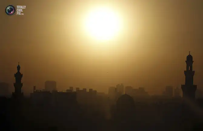 Солнце садится за минаретами мечетей в тумане над Каиром.