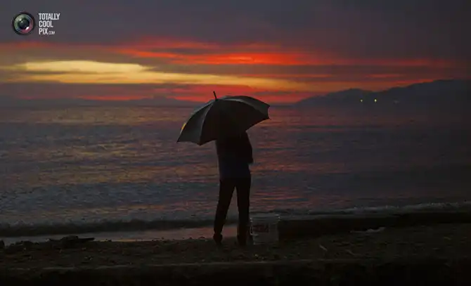 Женщина стоит под зонтом на побережье в городе Запад Ванкувер, Британская Колумбия.