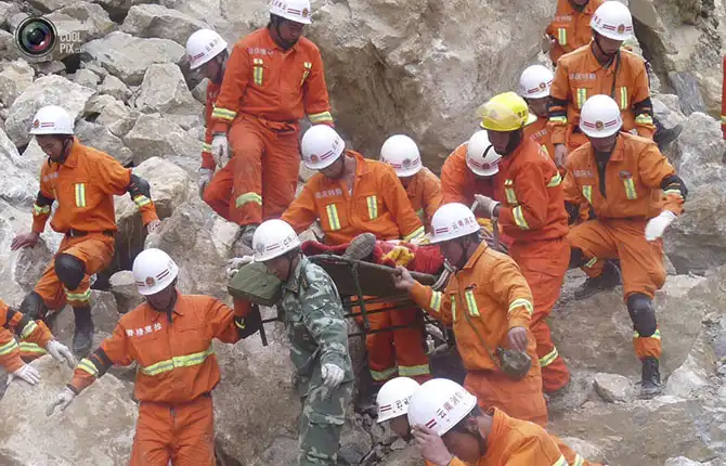 Спасатели несут пострадавшего после землетрясения магнитудой 5,9 балла в уезде Дечен в провинции Юньнань, Китай.