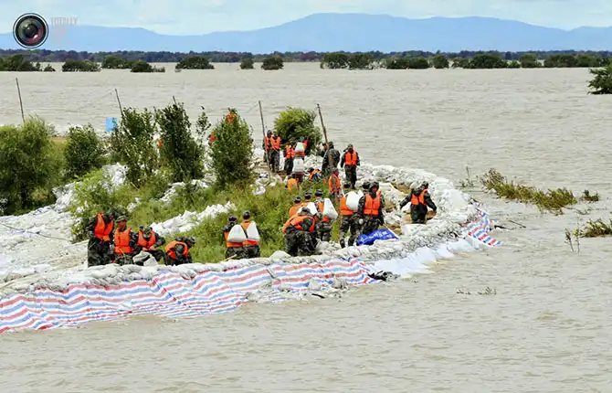 Солдаты строят дамбу из мешков с песком на берегу реки близ Тунцзяна в провинции Хэйлунцзян, Китай.