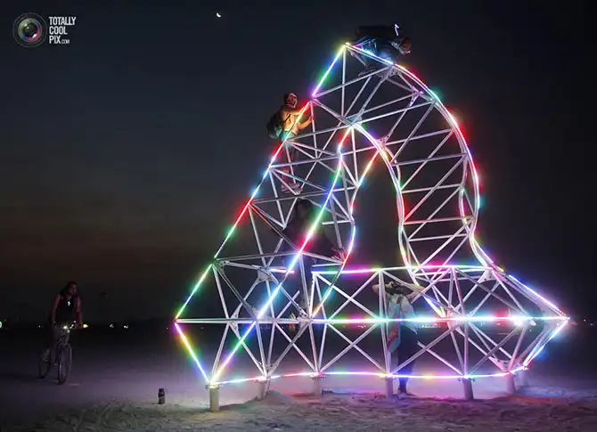 Участники фестиваля музыки и искусств «Burning Man 2013» взбираются на художественную инсталляцию в пустыне Блэк-Рок, штат Невада.