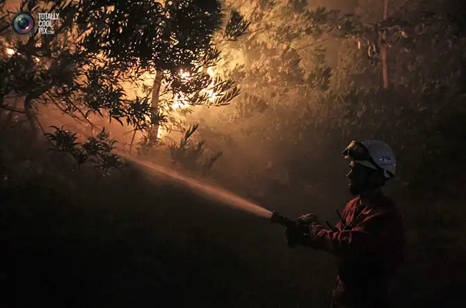 Пожарный борется с лесным огнём к северу от Лиссабона, Португалия.