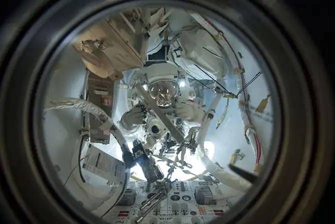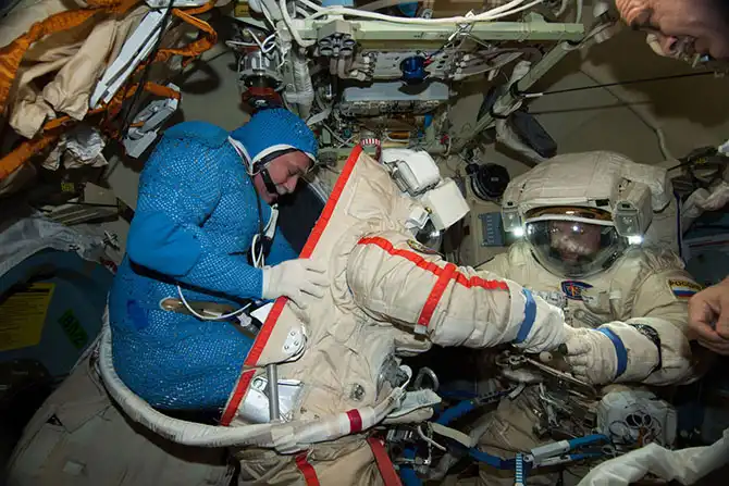 Подготовка к выходу в открытый космос. Слева — космонавт Федор Юрчихин, надевает скафандр. МКС, 21 июня 2013.