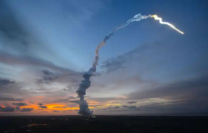 А это, кстати, запуск грузового корабля «Альберт Эйнштейн» 5 июня 2013 с помощью ракеты-носителя тяжелого класса «Ариан-5ES» из Гвианского космического центра на Куру.