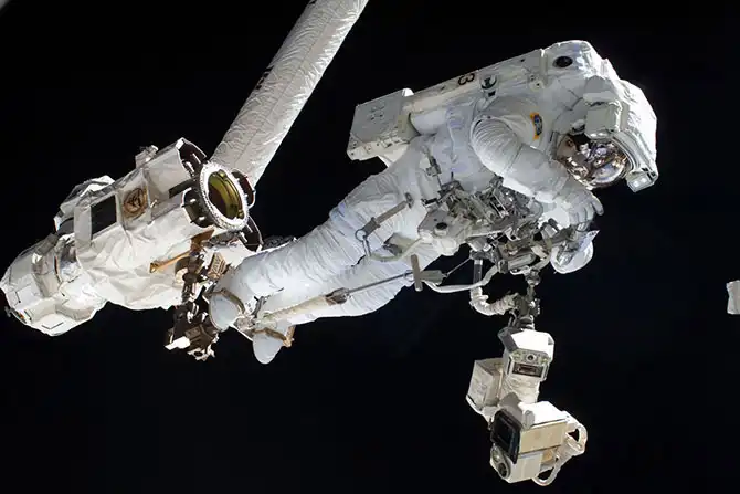 Итальянский космонавт ЕКА Лука Сальво Пармитано в открытом космосе, 9 июля 2013.