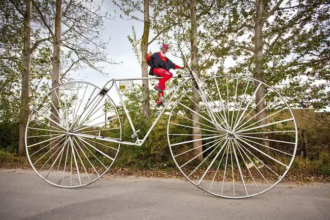 Диаметр колес велосипеда составляет 3.2 метра. Он создан Диди Зенфтом из Германии, который является знаменитым прыгающим в костюме дьявола супер-болельщиком велогонки Тур де Франс.