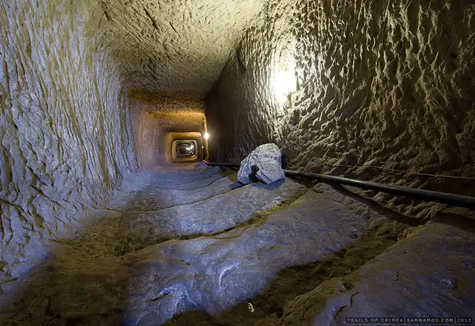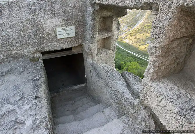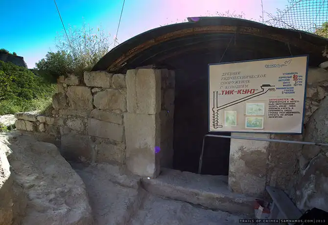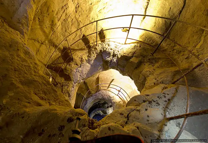 Неподалеку, у подножья крепости Чуфут-кале, расположен еще один, гораздо более скромный по масштабам, артезианский колодец. Раньше он также располагался в толще породы, но то ли кусок породы отвалился, то ли археологи прорубили стену, и сейчас он представляет из себя разрез прям у подножья крепости:
