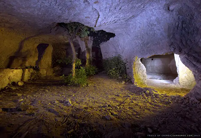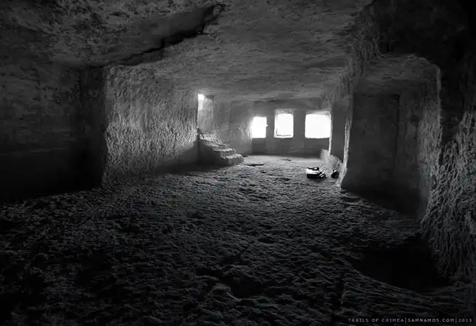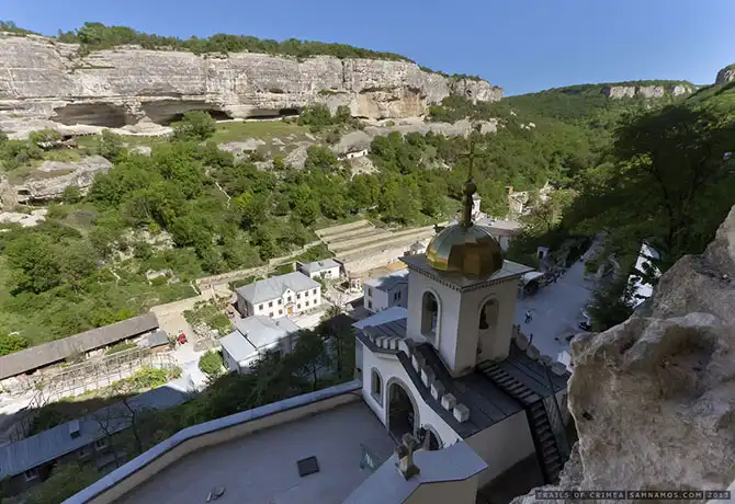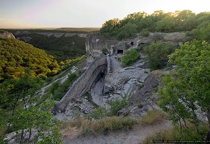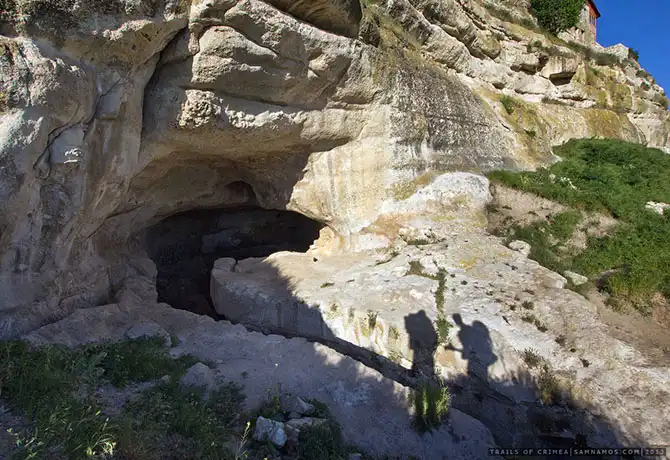 С юго- западной стороны расположен небольшой комплекс хозяйственных пещер и несколько построек. Большая и Малая кенассы (молитвенный дом караимов):