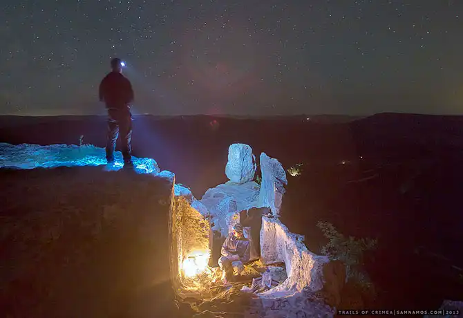 Стоянку было решено устроить на так называемом «Зубе дракона» прямо в одном из гротов т.к. все плато продувается неслабым ветром. Место оказалось очень уютным, и мы душевно отметили последнюю ночь нашего трипа в Крыму небольшим костром: