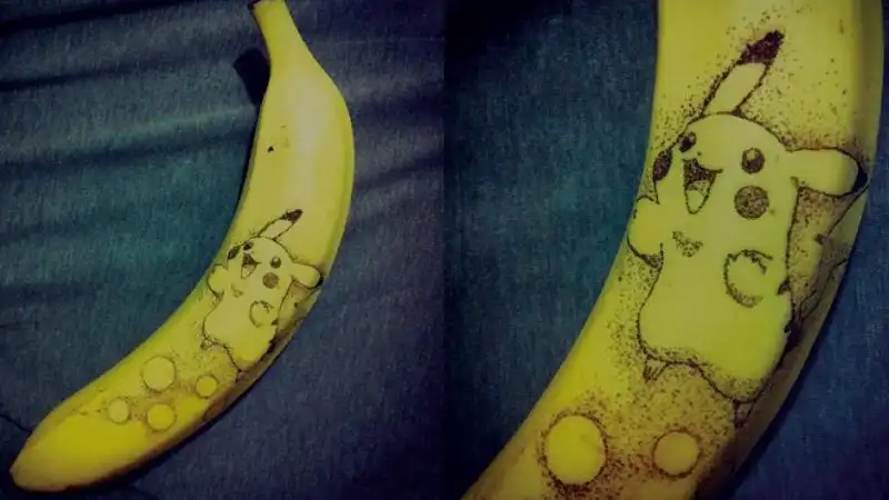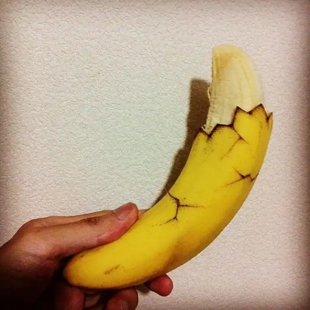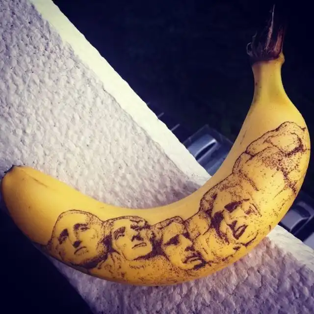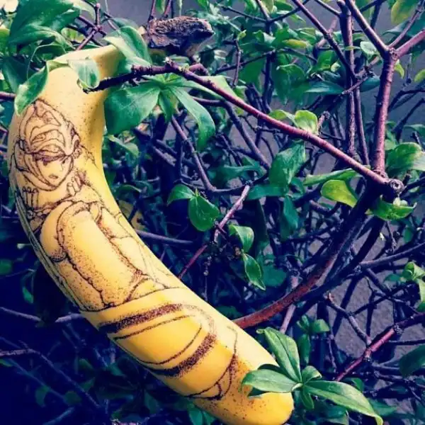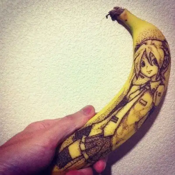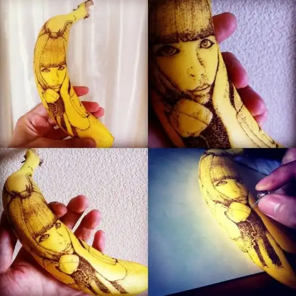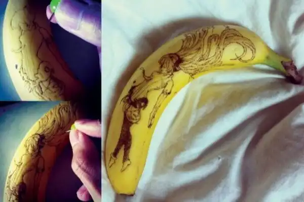 Японский художник Энд Кейп, работающий в Токио, специализируется на нанесении татуировок бананам. Процесс может затянуться по пяти часов, а то и более - в зависимости от сложности рисунка. После завершения работы нужно обязательно сфотографировать банан, потому как картина полностью исчезает через день-два.