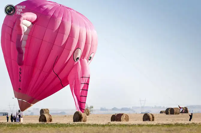 Воздушный шар, принимавший участие в чемпионате Канады по воздухоплаванию, приземляется в поле в городе Хай Ривер, Альберта, Канада.