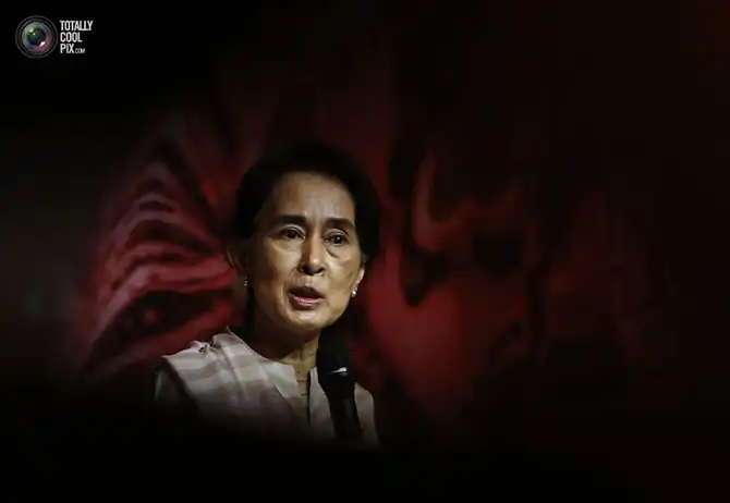 Лидер «Национальной лиги за демократию» Аун Сан Су Чжи выступает перед мьянманской диаспорой на острове Сентоса в Сингапуре.