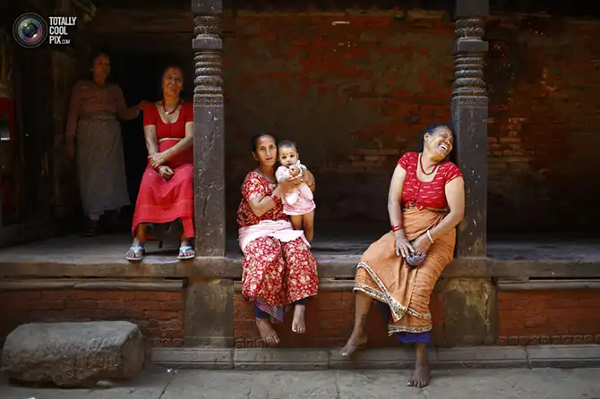 Женщины сидят возле дома в древнем городе Бхактапур, Непал.