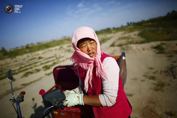 Женщина собирает хлопок возле пересохшей реки в провинции Ганьсу, Китай.
