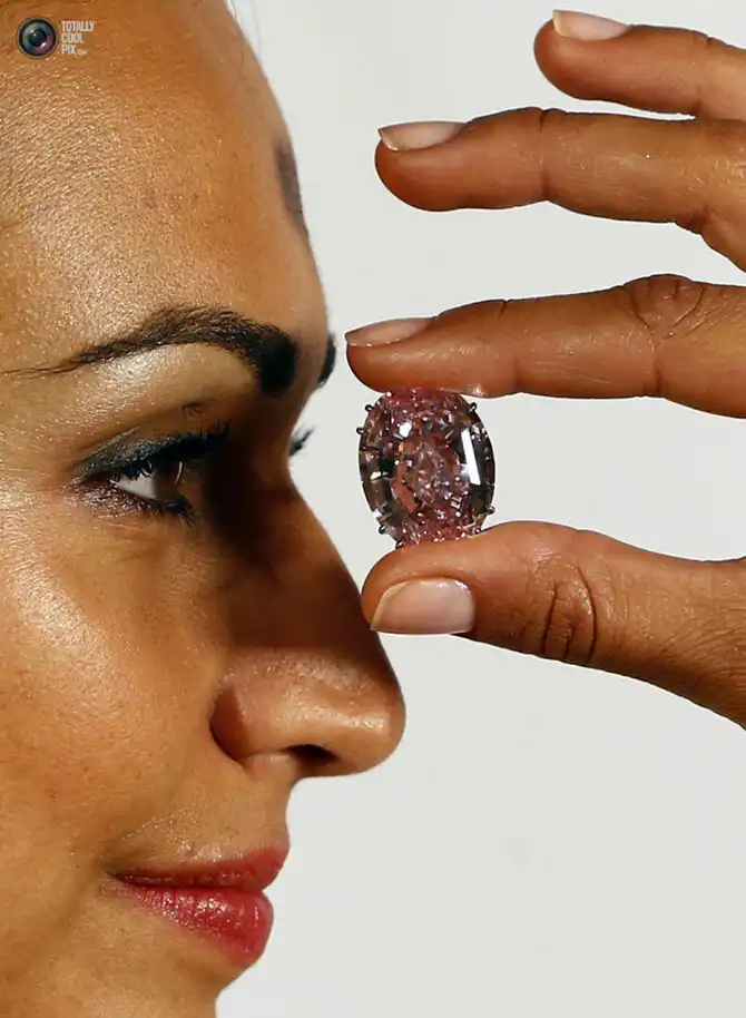 Модель демонстрирует бриллиант «Розовая звезда» величиной 59,6 карат на аукционе Sotheby’s в Женеве, Швейцария.