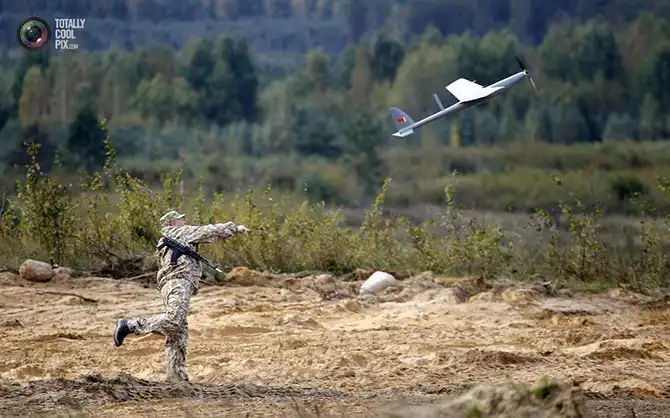 Солдат запускает самолёт на военном полигоне недалеко от города Осиповичи, Беларусь.