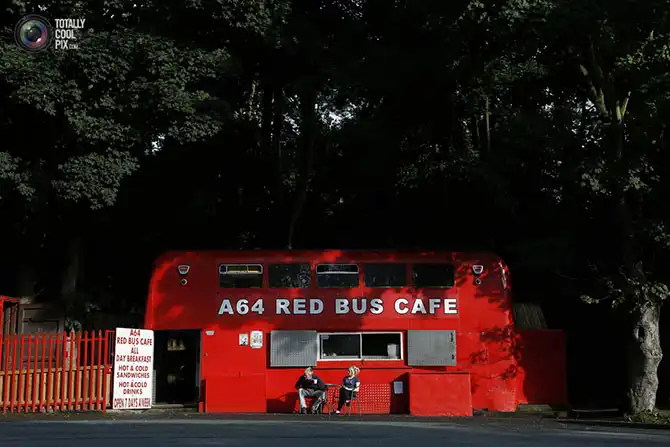 Люди сидят возле двухэтажного кафе Red Bus Café вдоль шоссе A64 недалеко от городка Торнер на севере Англии.