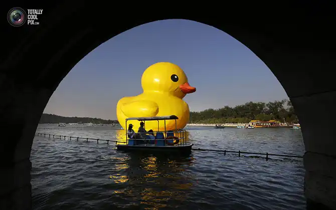 Туристы проплывают мимо надувной резиновой утки авторства голландского художника-концептуалиста Флорентина Хофмана на озере в Пекине, Китай.