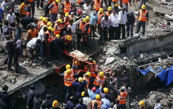 Спасатели ищут выживших на месте обрушения дома в Мумбаи, Индия.