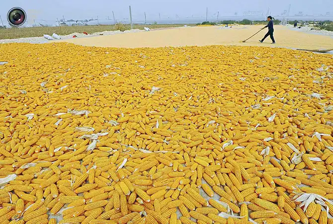 Фермер сушит кукурузу возле поля в городе Qingzhou, Китай.