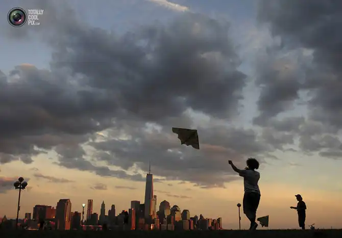 Женщины запускают воздушных змеев в парке у реки Гудзон в Хобокене, штат Нью-Джерси.