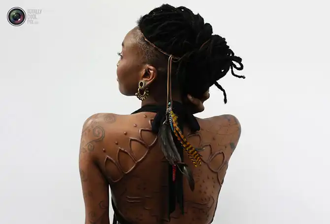 Модель демонстрирует татуировки на 9-м съезде любителей татуажа London Tattoo Convention в Лондоне.