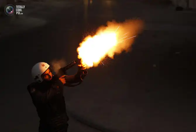 Полицейский применяет слезоточивый газ во время антиправительственной демонстрации в городе Maqusha к западу от Манамы, Бахрейн.
