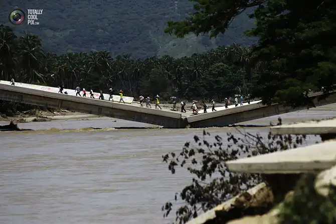 Сельские жители идут по повреждённому мосту в муниципалитете Коюка-де-Бенитес, Мексика.