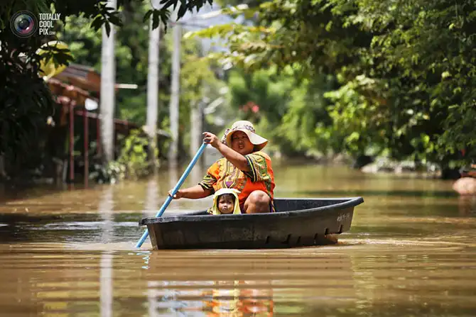 Буддийский монах показывает журналистам свой затопленный храм в провинции Аюттхая, Таиланд.