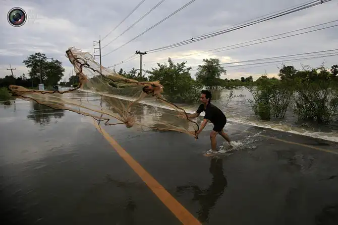 Мужчина забрасывает сеть на затопленной улице в провинции Прачинбури, Таиланд.