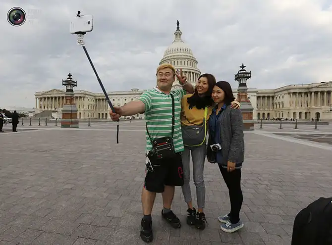 Южнокорейские туристы фотографируются на фоне Капитолия в Вашингтоне.
