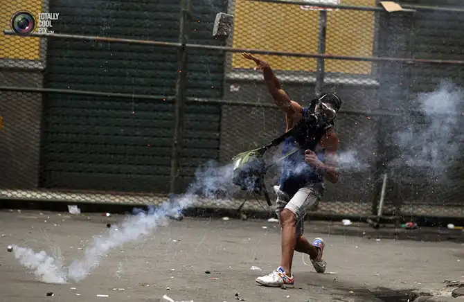 Демонстрант бросает камень в полицию во время акции протеста учителей в Рио-де-Жанейро, Бразилия.