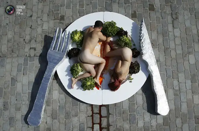 Активисты организации по защите животных Anima Naturalis пропагандируют вегетарианство в центре Барселоны, Испания.